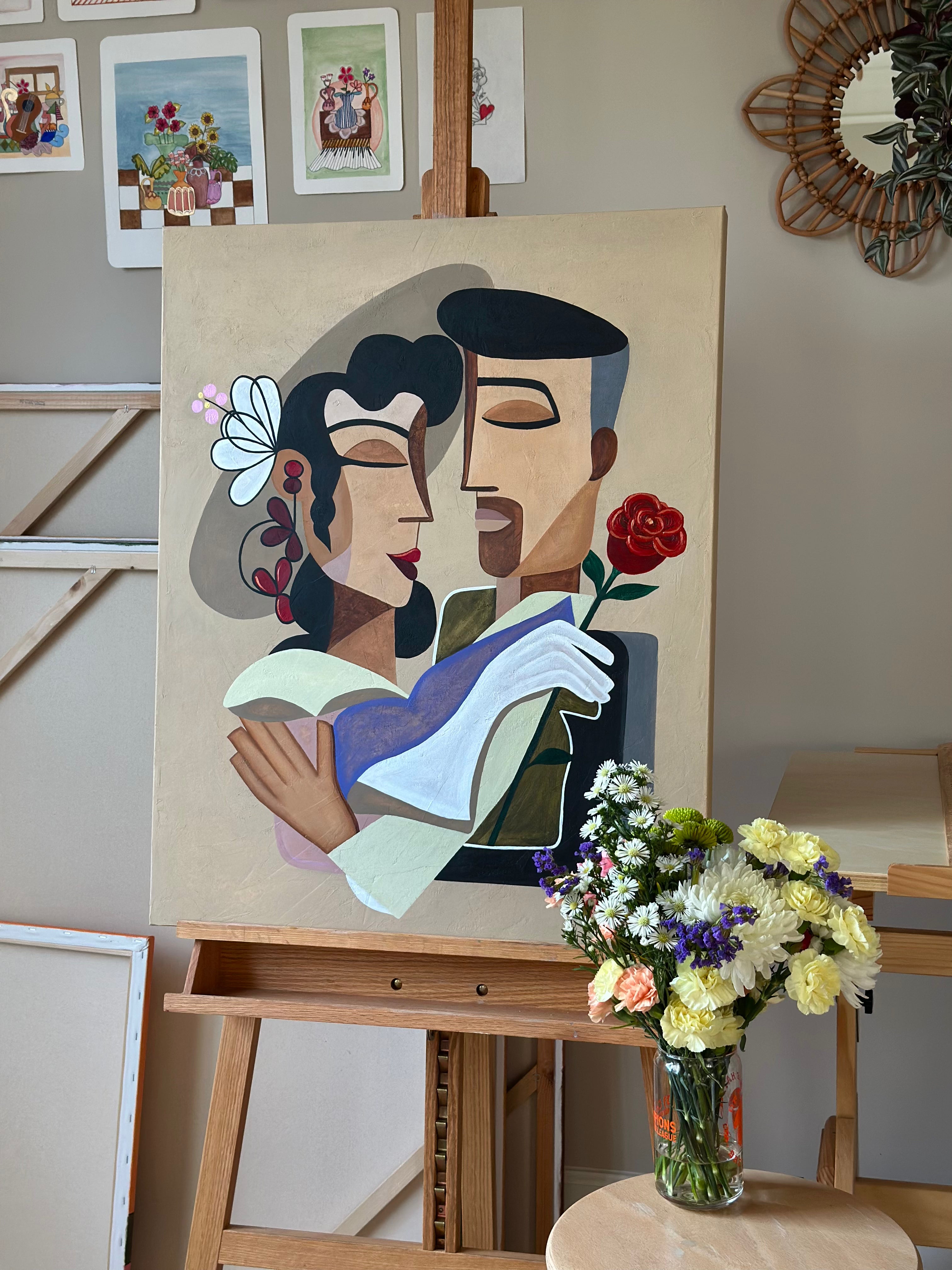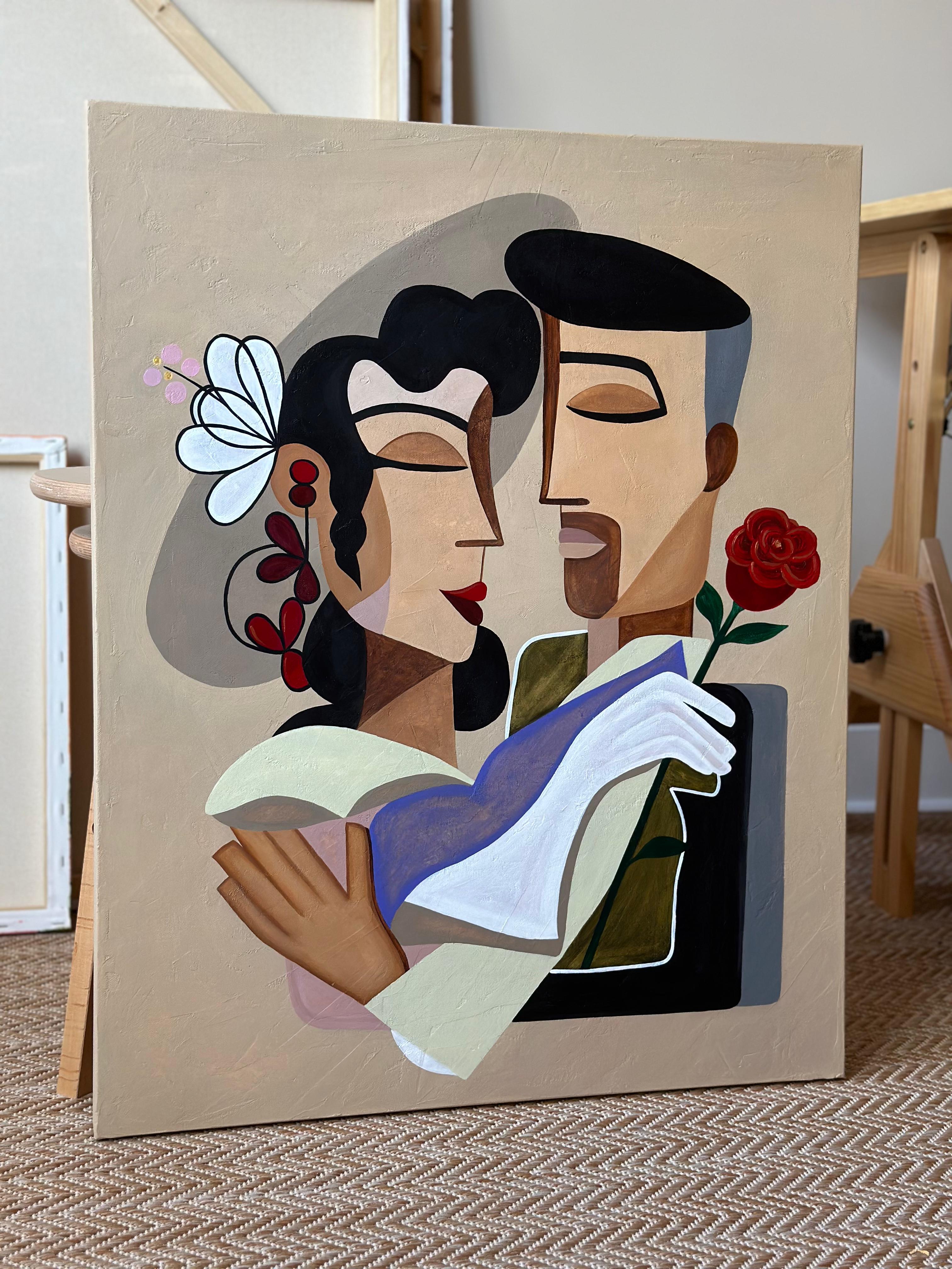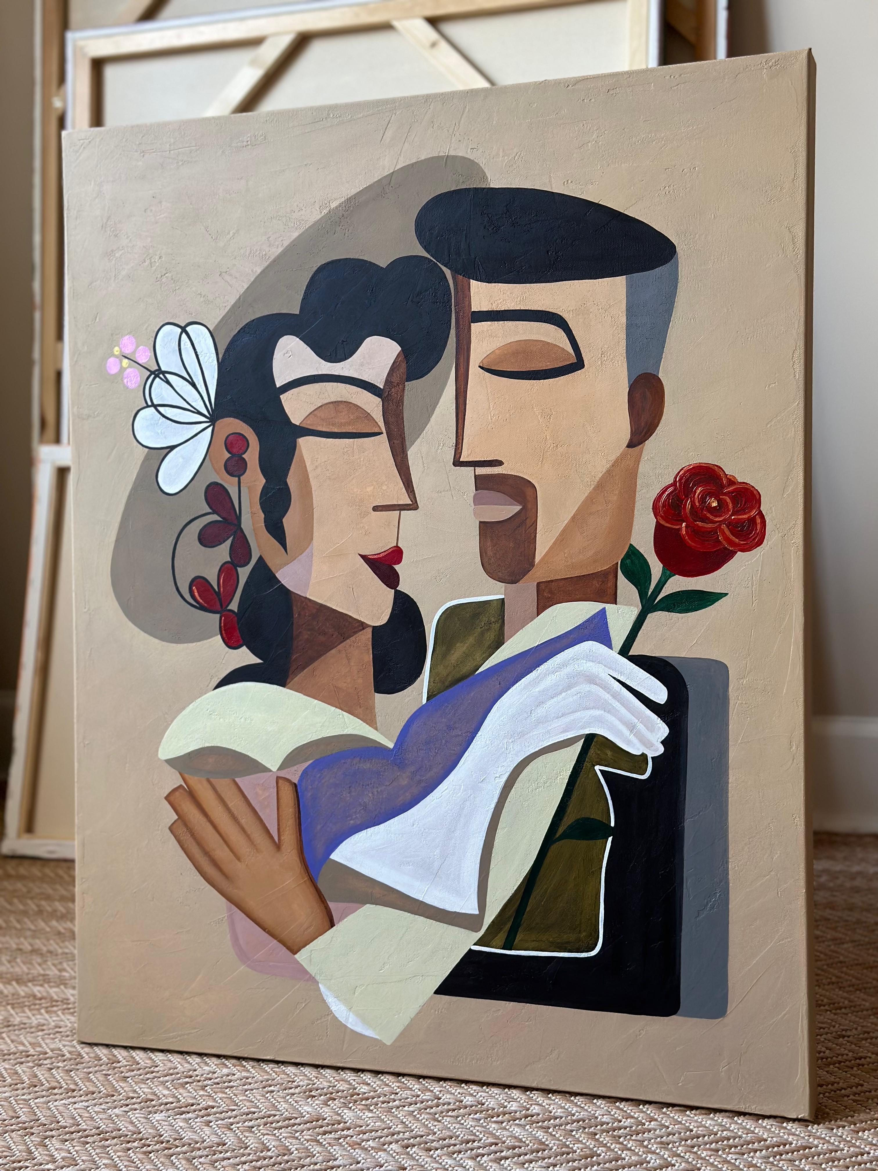"Forever Yours" reflects a timeless romance with a touch of elegance. The red rose in the painting symbolizes passionate love, while the soft tones and classic style evoke the feeling of a love story from another era.