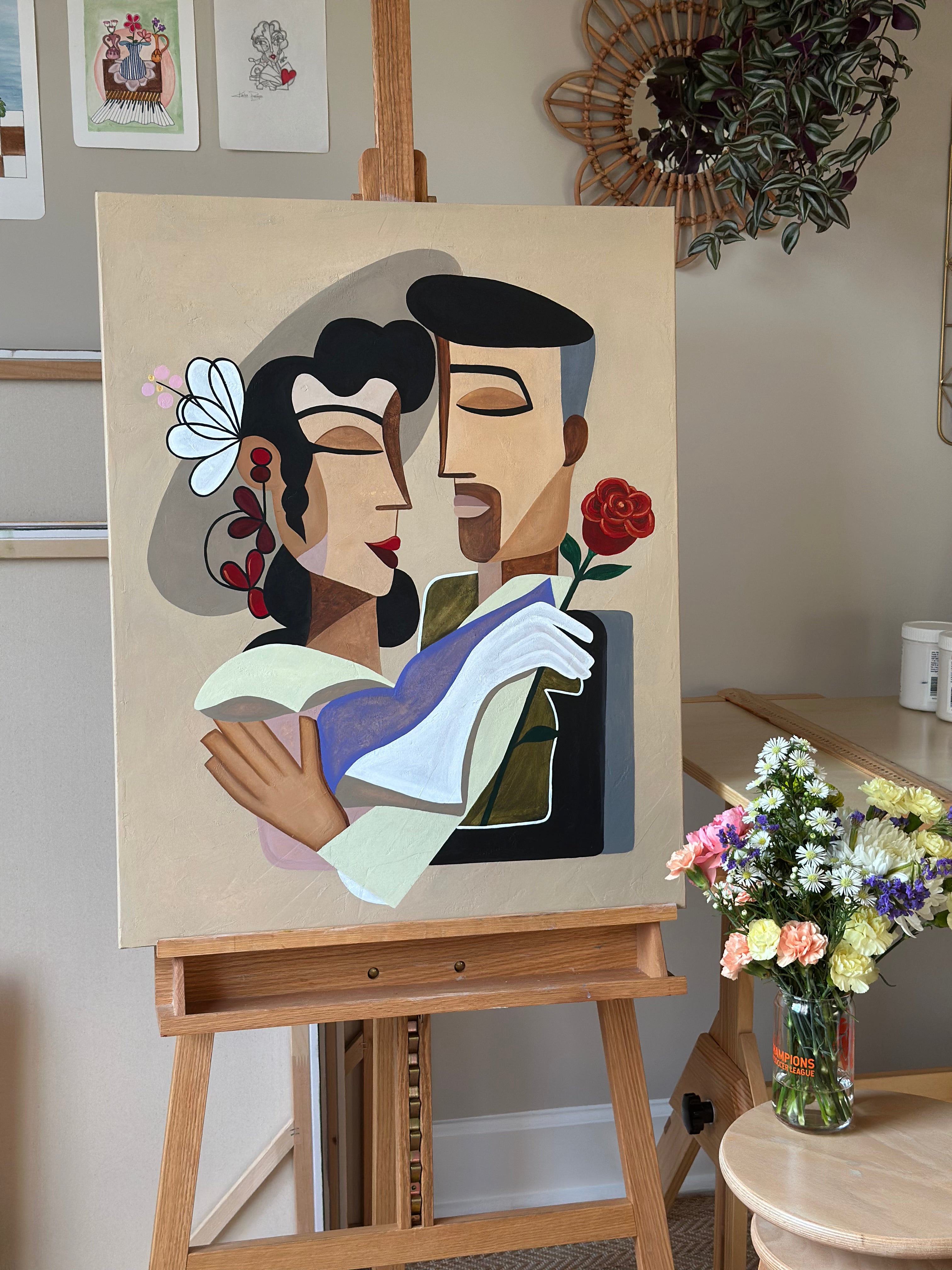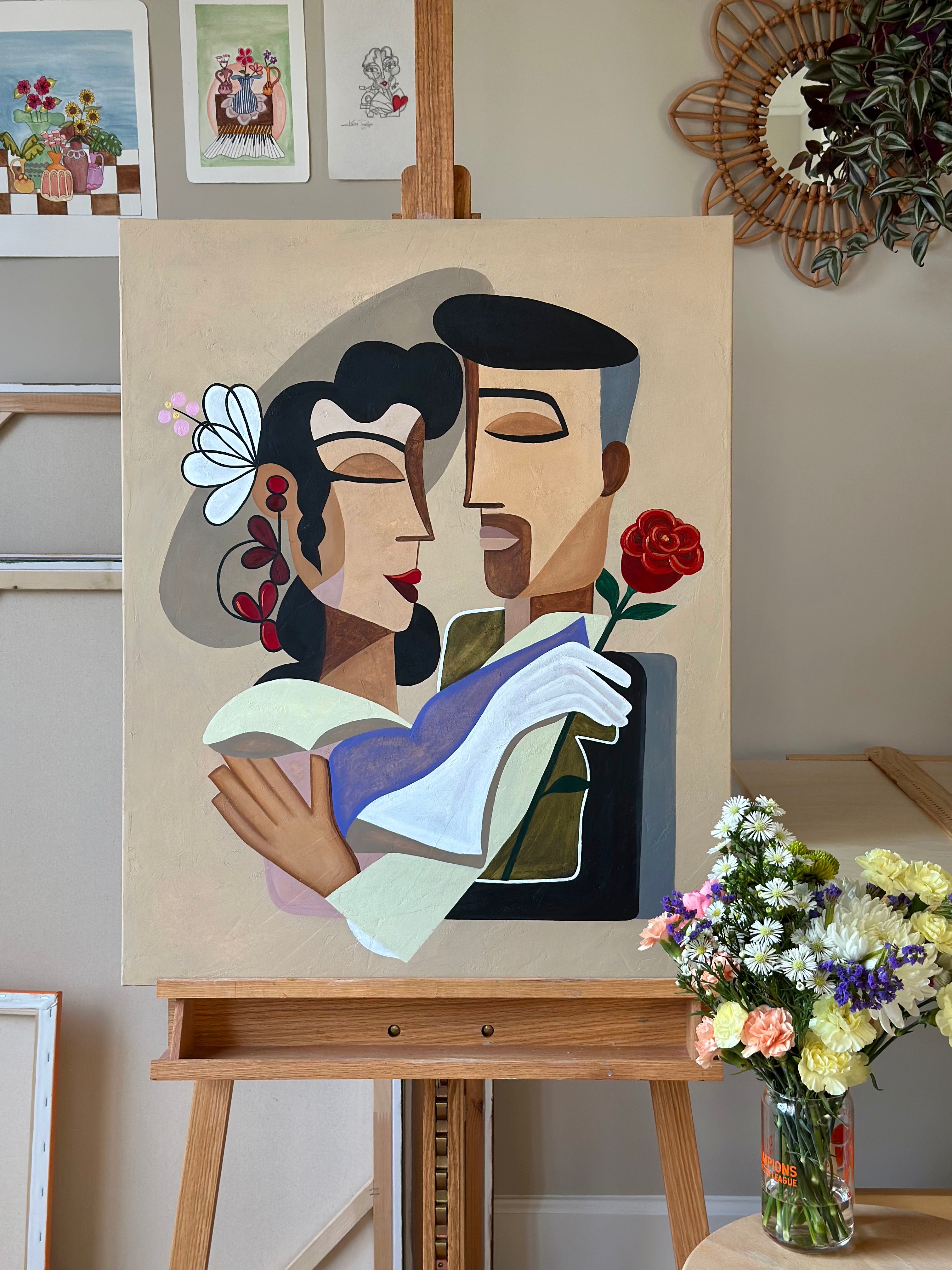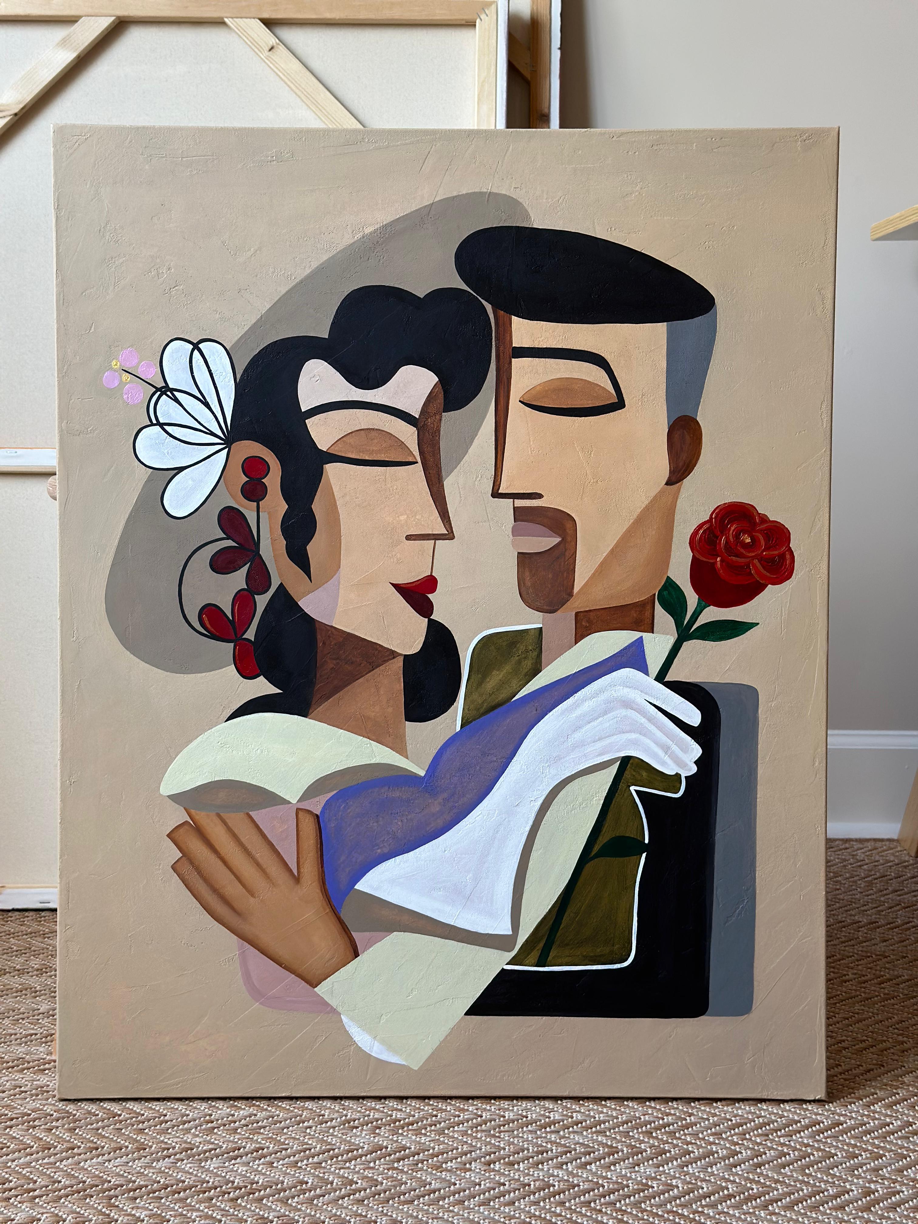 "Forever Yours" reflects a timeless romance with a touch of elegance. The red rose in the painting symbolizes passionate love, while the soft tones and classic style evoke the feeling of a love story from another era.