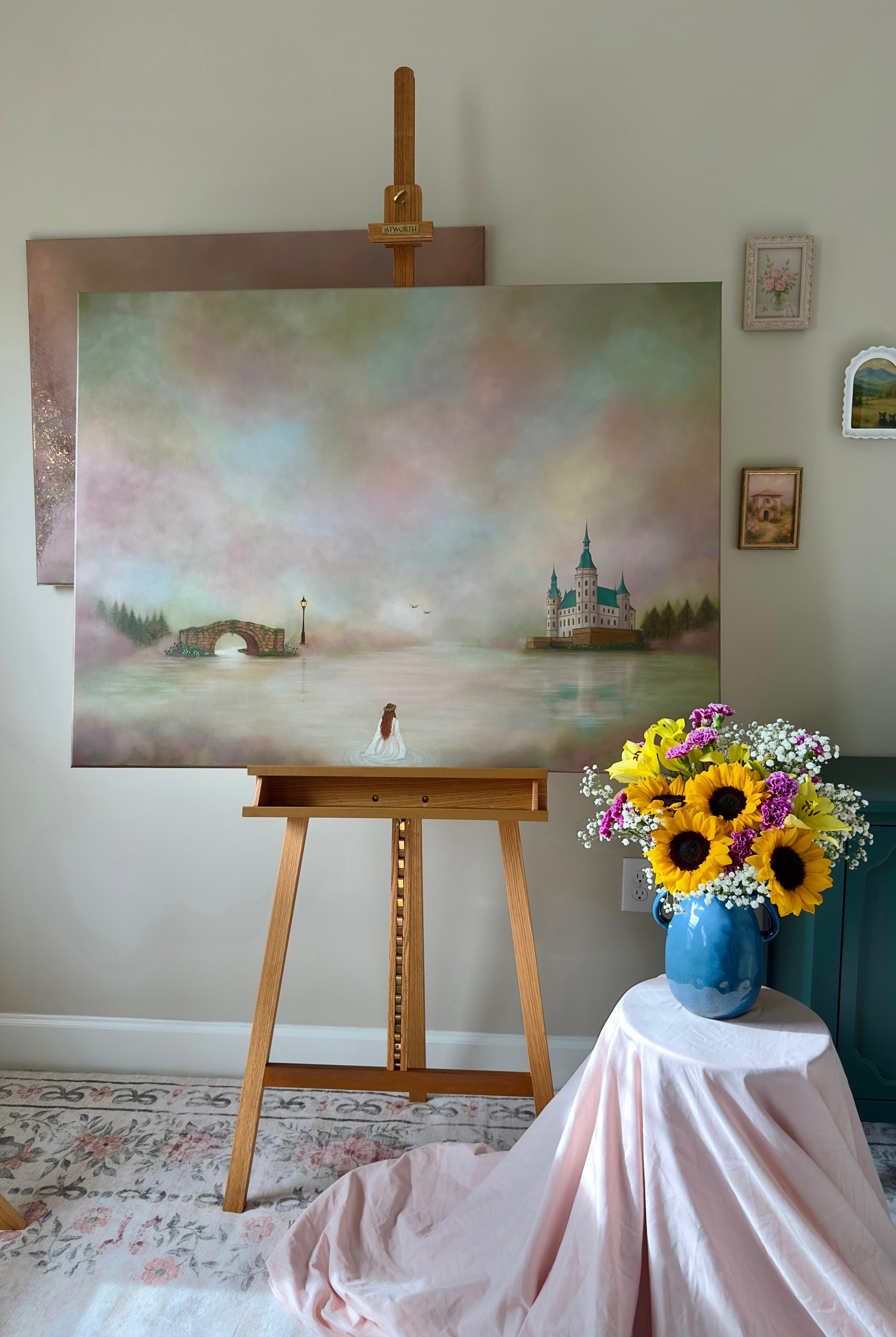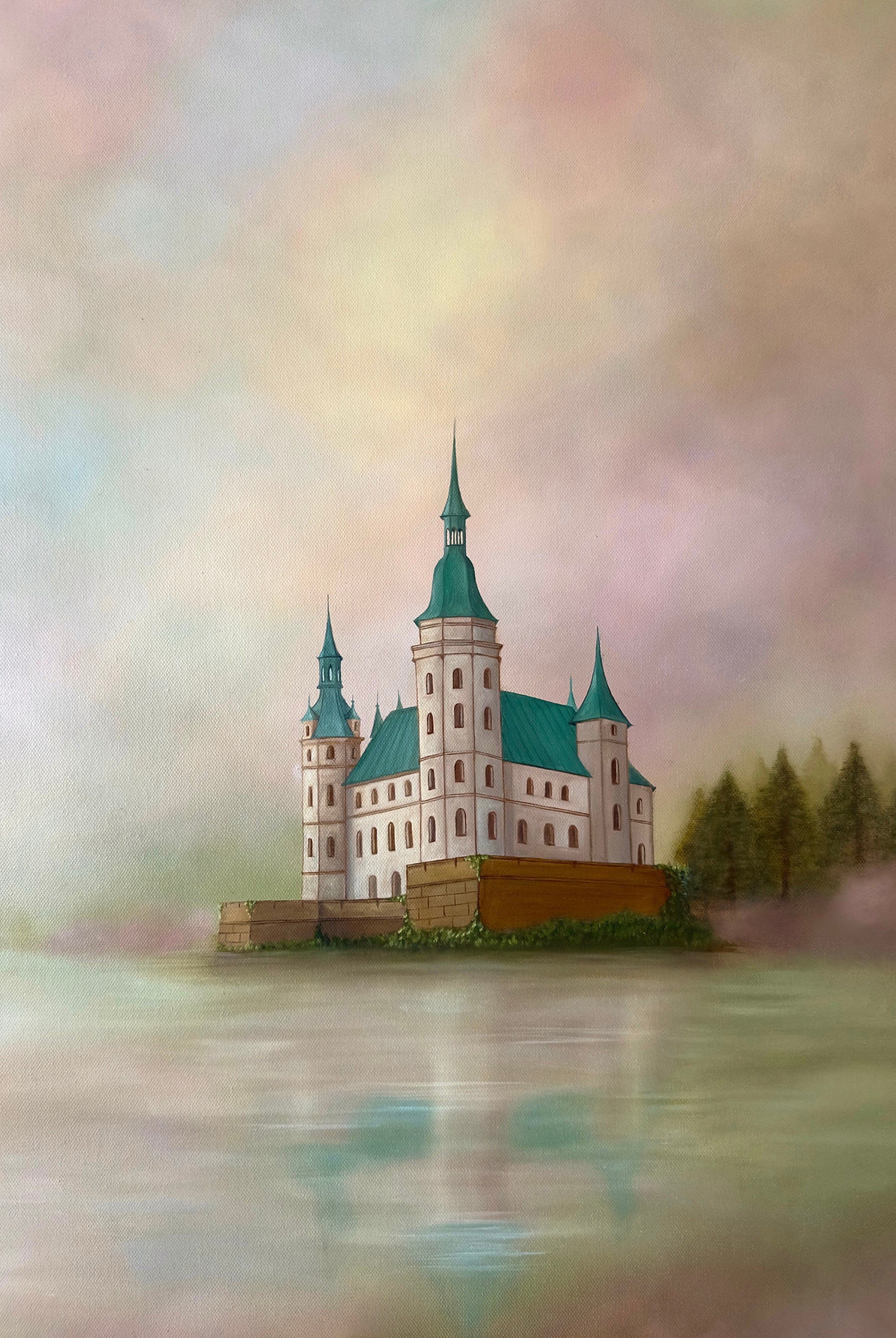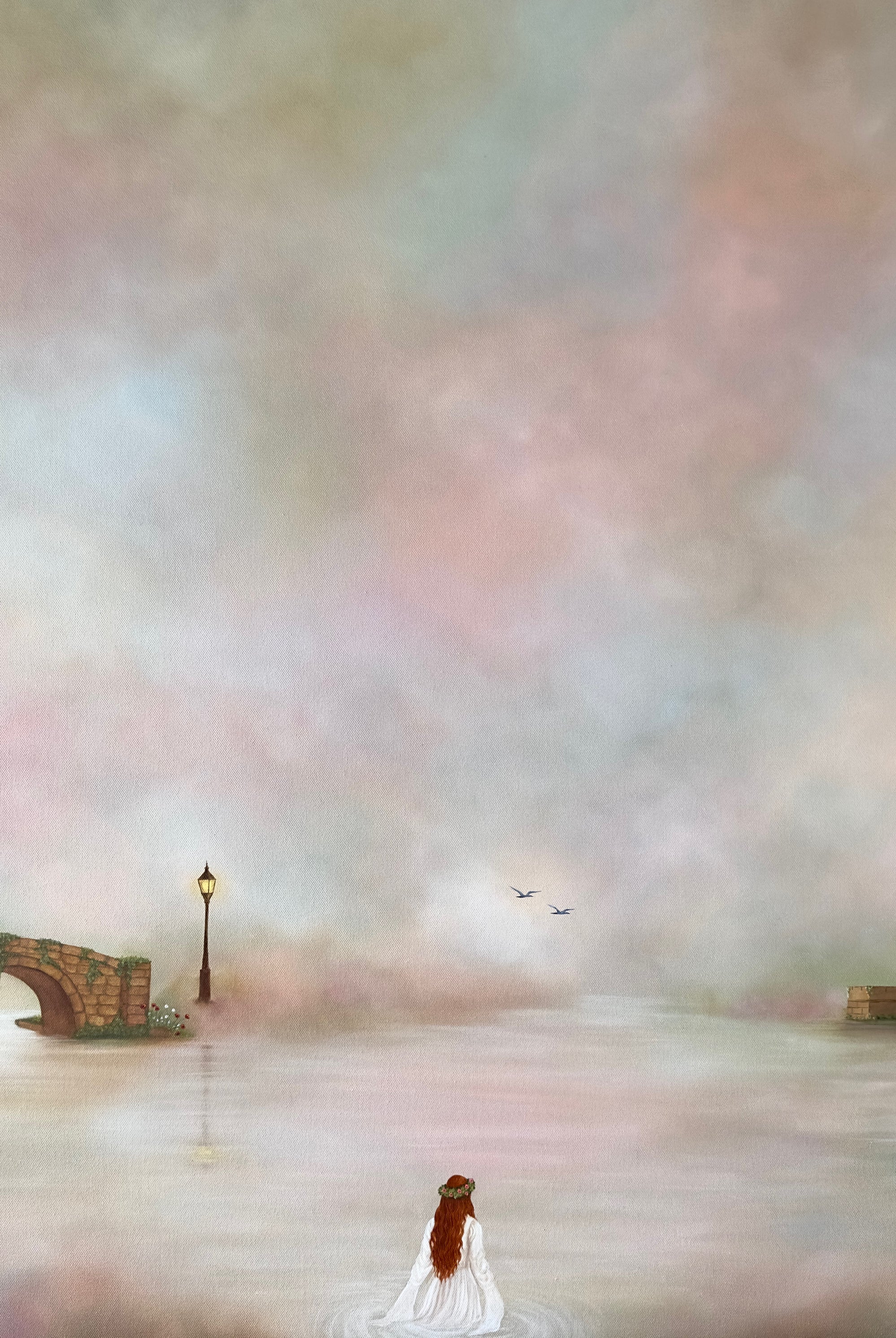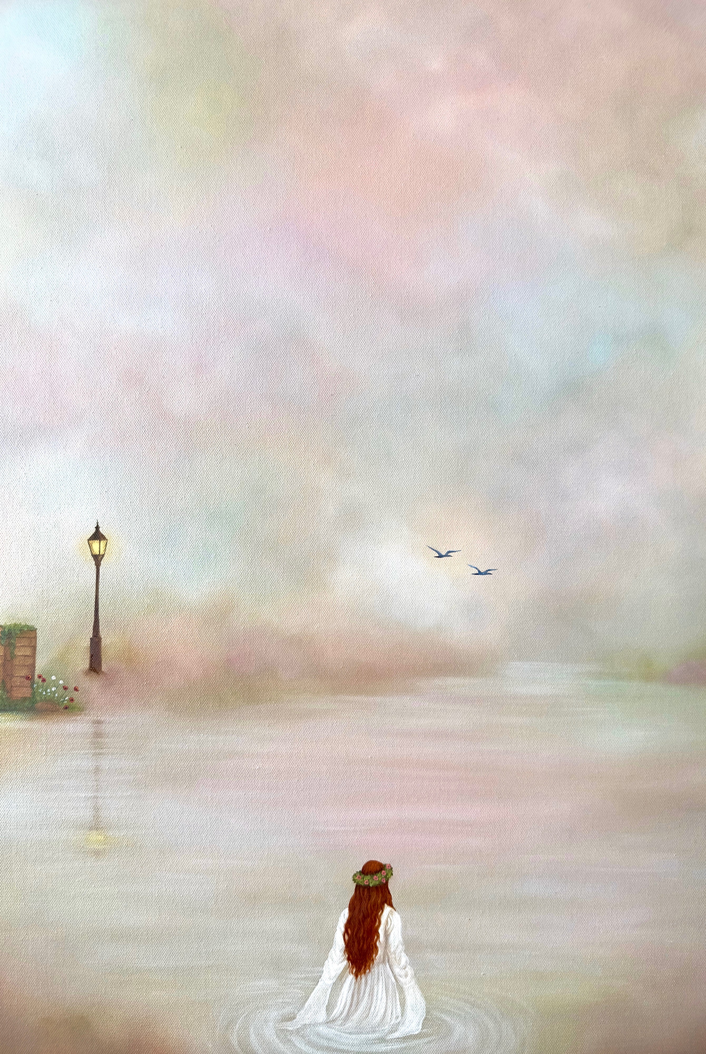 This painting is a soft, atmospheric piece that blends a dreamlike landscape with a sense of quiet strength, designed to bring calm, elegance, and a subtle narrative into your space.